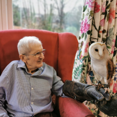 Laura said: “Having Sue and Tony come and show Mike the owls was a dream come true for him. He is such an owl fanatic and seeing him holding one was amazing. He was overjoyed, going from being overwhelmed to start with to relaxing and holding them. I can’t thank Sue and Tony enough for coming along and giving up their time to show the owls and talk to Mike and our other residents. We all learned about what the birds eat, how much they weigh, how old they tend to live to and much more information. And it was a real treat for everyone, especially Mike, to see Charlie fly across the room. Mike even came to sit next to Myles who was flying Charlie and called her name so she would fly towards them.”